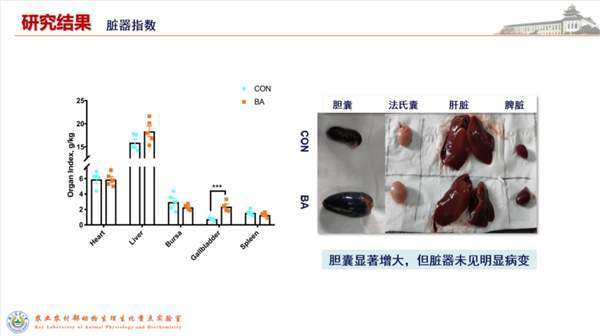 在幼龄动物中,由于肝功发育相对不完善,胆汁酸分泌不足会引起脂肪性腹泻。研究发现,在安全剂量下体外补充胆汁酸,对断奶仔猪脏器指数及血液生化指标没有不良影响,说明胆汁酸在幼龄动物中应用的安全性。胆汁酸存在肠肝循环调控,动物无法利用的胆汁酸会随粪便排出体外。