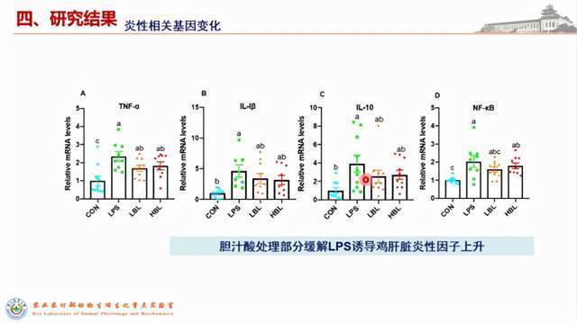 陈文静博士汇报了胆汁酸在抑制炎性反应中的作用机制。倪教授的研究发现,在低脂日粮中添加胆汁酸能够促进肉鸡的生长,能够起到在节约饲料成本的同时保障动物的健康生长,提高生产性能。赵茹茜教授在会议总结中提出,体外实验胆汁酸有明确抑菌效果;在攻毒实验动物中,胆汁酸处理组动物会出现一定腹泻现象,与动物腹泻生理性排毒机制有关,通过粪便的排泄将体内毒素排出,减少对动物的健康损害。研究还发现,内毒素的排泄效率与胆汁酸剂量正相关。