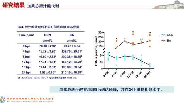 胆汁酸的作用不是瞬时的,能够在动物体内稳定发挥作用。胆汁酸存在肠肝循环作用,肠道吸收的胆汁酸回到肝脏后,随胆汁分泌又回到肠道中,有高效的循环利用效果。在仔猪的动物实验中,研究发现体外摄入胆汁酸能显著提高血浆总胆汁酸浓度,8小时后血浆总胆汁酸浓度达到峰值,且在24小时稳定维持相似水平。该实验说明胆汁酸的生物利用度很高,能够在血浆中维持一定浓度来发挥作用。
