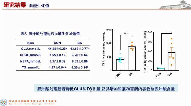 血糖及血脂过高对动物健康有明确的危害。在胆汁酸处理组的动物中,体外补充胆汁酸能够提高胆囊及盲肠内胆汁酸含量,血液生化检测血糖及甘油三酯指标均显著降低,说明胆汁酸能够加快脂肪及糖类营养的营养代谢,维持血液健康状态。